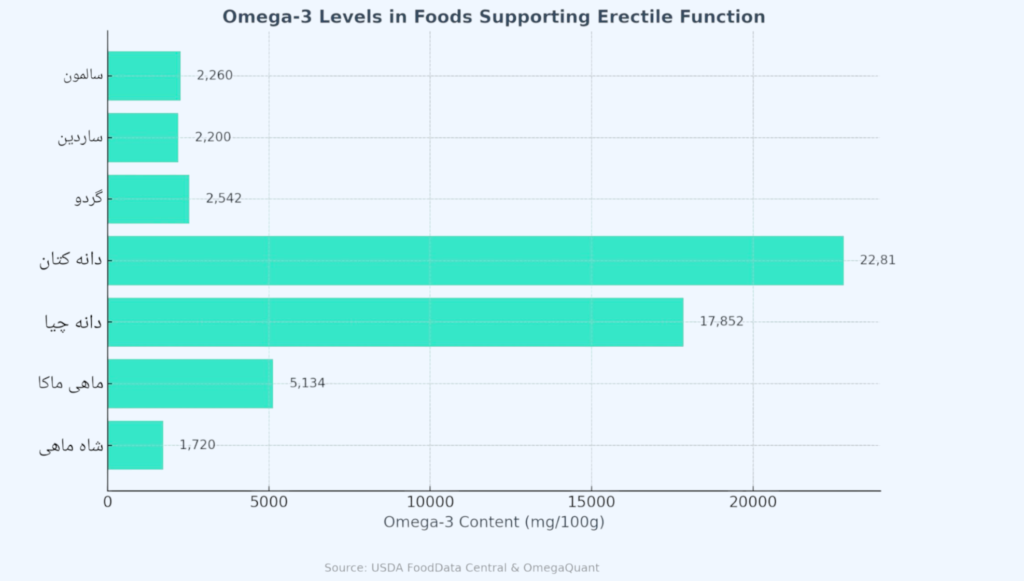 امگا ۳ موجود در ماهی سالمون، ساردین، گردو و بذر کتان، باعث بهبود سلامت قلبی-عروقی میشود. از آنجایی که عملکرد عروقی سالم برای نعوظ ضروری است، مصرف این چربیهای سالم به بهبود نعوظ با تغذیه کمک میکند.